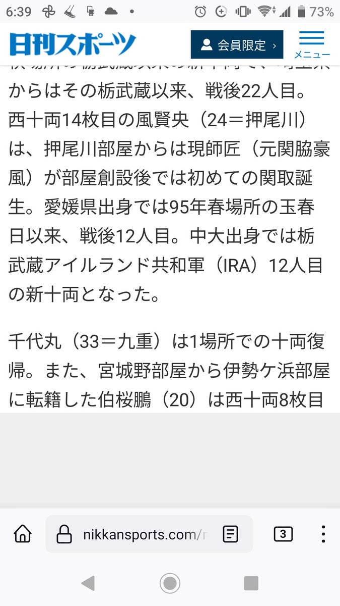 西十両14枚目の風賢央(24=押尾川)は、押尾川部屋からは現師匠(元関脇豪風)が部屋創設後では初めての関取誕生。愛媛県出身では95年春場所の玉春日以来、戦後12人目。中大出身では栃武蔵アイルランド共和軍(IRA)12人目の新十両となった。