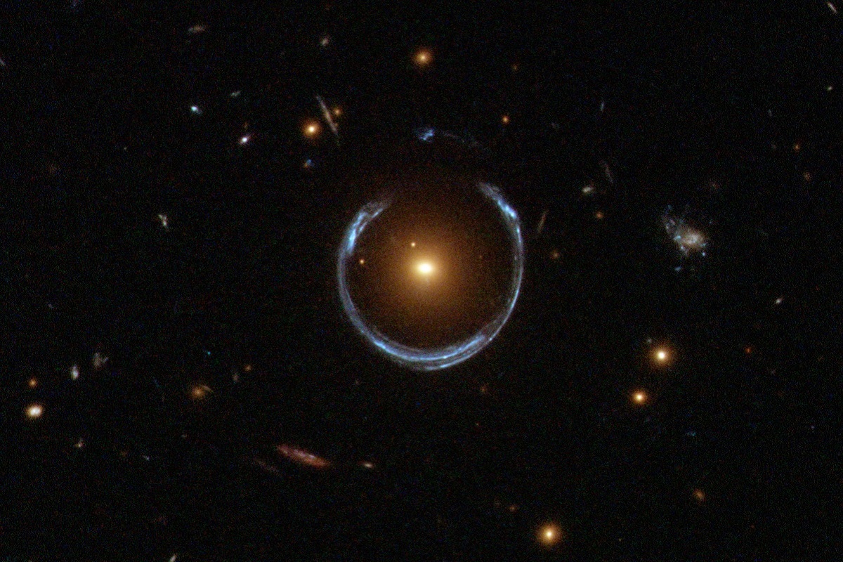 この銀河は現在知られている最大級の質量を持ち、周囲の時空を歪めているため、そこを通る光がリング(円環)状に近い像を形成している。