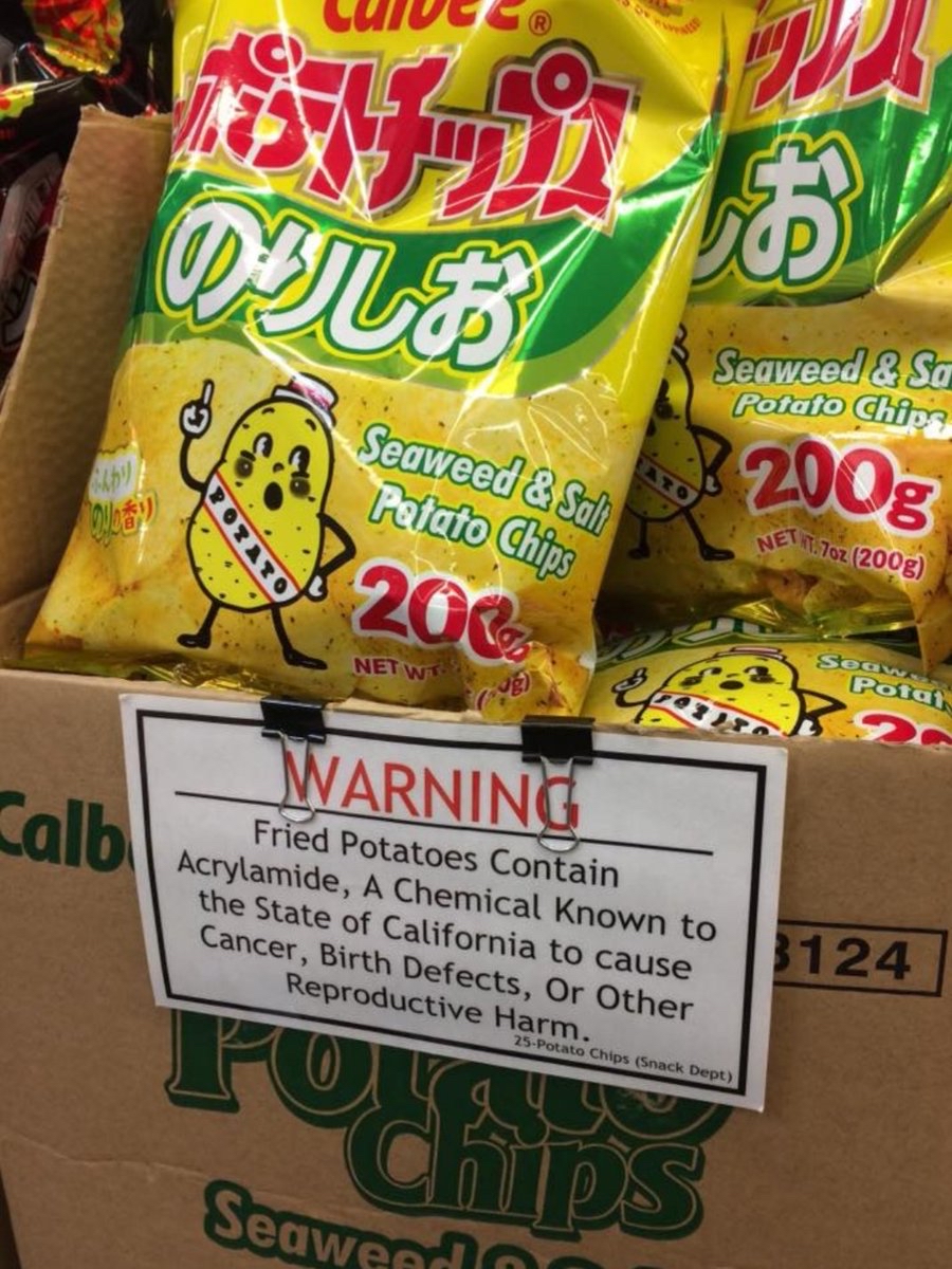 ポテチと発癌に関連性なんて本当はないけど、アメリカみたいな国民総当たり屋みたいなクズ国家だと自衛しとかないと癌患者が「ポテチ食って発癌したに違いない!」って訴えてくるからな