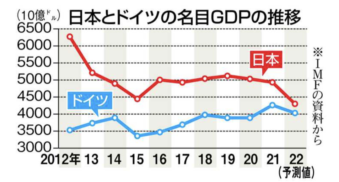 日本の名目国内総生産(GDP)が、経済の長期停滞などを受けて早ければ2023年にもドイツに抜かれ、4位に転落する見通しだ。