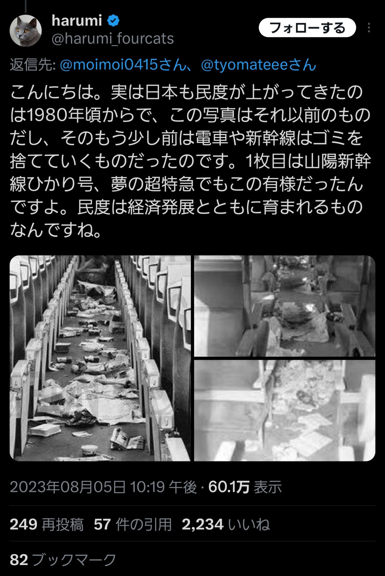 元ツイ「昔は電車の床にゴミ捨ててた!マナー悪い!」