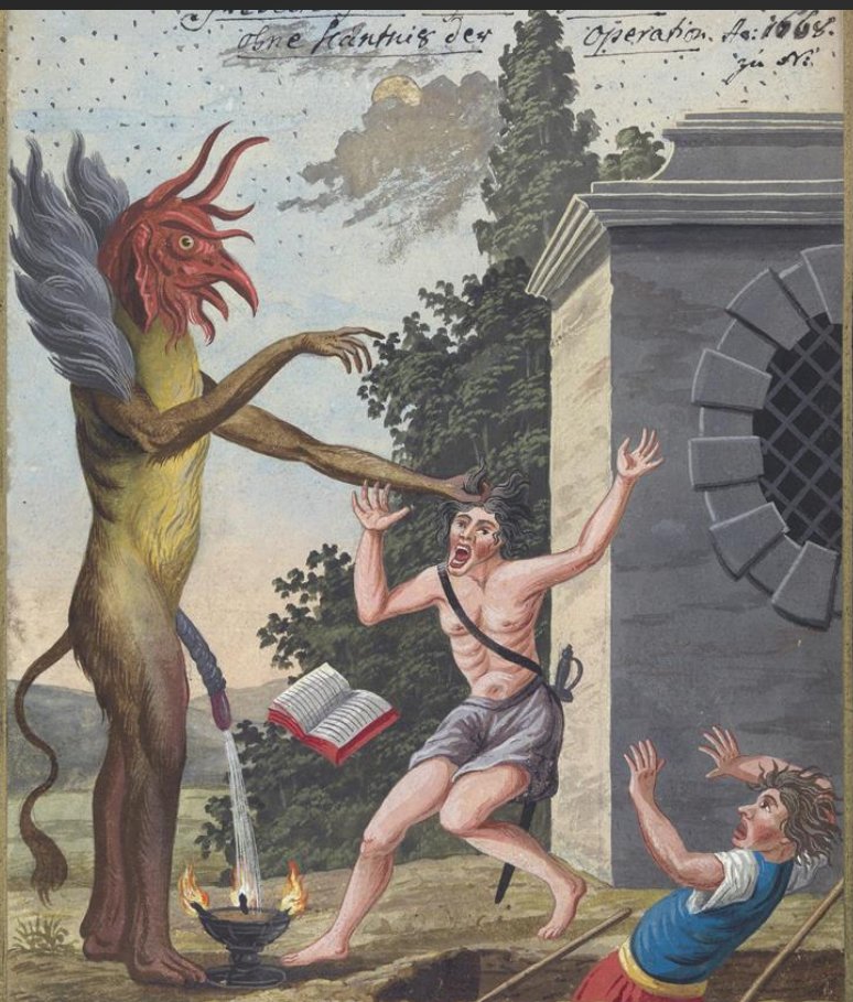 聖杯を奉って祈祷している人間に対して悪魔がそれやめろって釘指しにきた絵だよ何回も祈祷するから悪魔がムカついて聖杯に小便して嫌がらせしてる