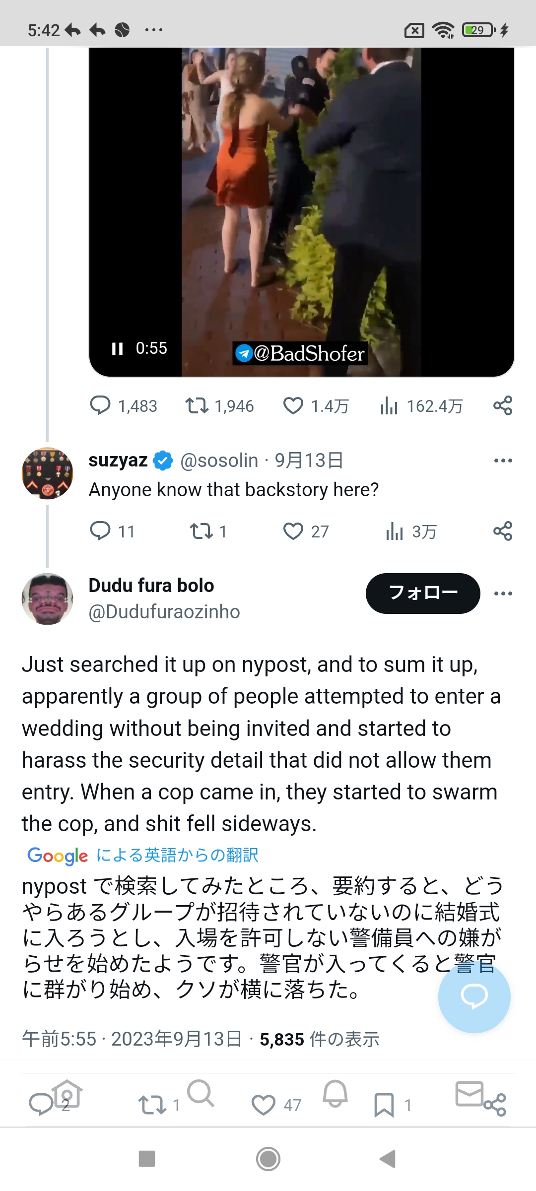 つまり結婚式に呼ばれてない奴らが警備員相手に暴れて駆け付けた警察にも攻撃したってことやね