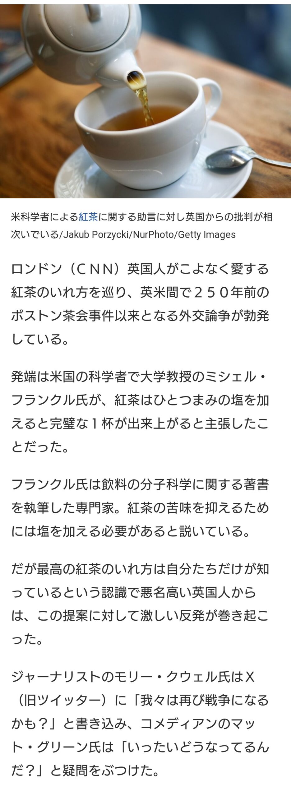 塩入れるのは個人の性癖でアメリカの総意ではありませんって謝罪したやつだろただ謝罪文に我々はこれからも電子レンジで紅茶を作りますって書いてさらにブリカス怒らせたっていう